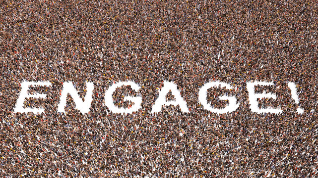 Concept or conceptual large community of people forming the word ENGAGE! 3d illustration metaphor for action, decision, motivation, strategy, promotion, communication and interaction and development