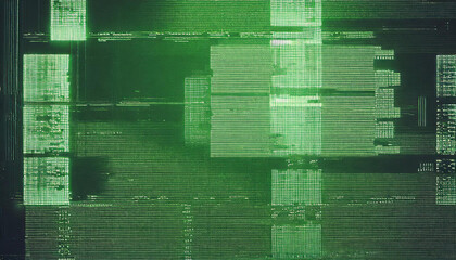 abstract technical background, green monitor with pixel sorting glitch effect, texture banner with copy space, error screen