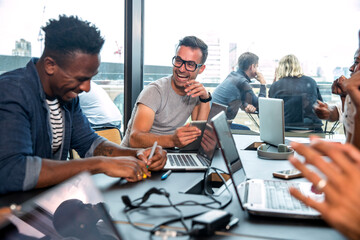 Group of young people discussing business while having meeting in the office