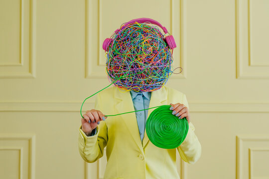 Woman with mask of chaotic thoughts listening to music near wall