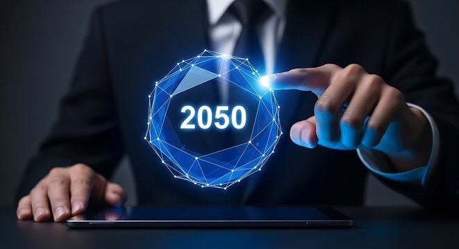 Modern business vision for 2050 with innovative technology, future planning and strategic foresight, shows success and digital transformation ahead