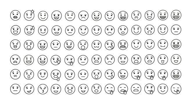 Wide array of sleek outline emoji icons depicting various human emotions, moods, and communicative gestures, ideal for digital media and user experience designs