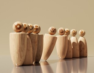 Wooden People with communicative icon on heads, stay in line with one gets out. Individuality,  thinking out of box idea, 3D rendering
