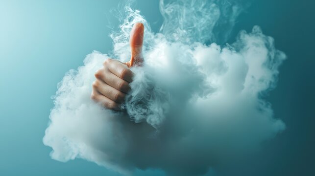 Hand Giving Thumbs Up Gesture Emerging from White Smoky Cloud