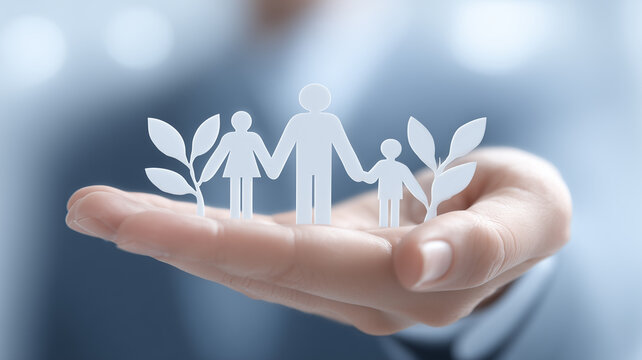 Paper family held in an open hand expressing insurance protection social care safety and community support for long term wellbeing.