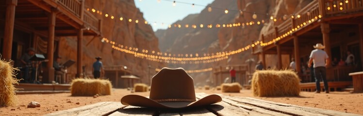 Western town canyon party scene with cowboy hat foreground. String lights illuminate rustic buildings, hay bales. People enjoy desert festival with live music, creating lively summer celebration