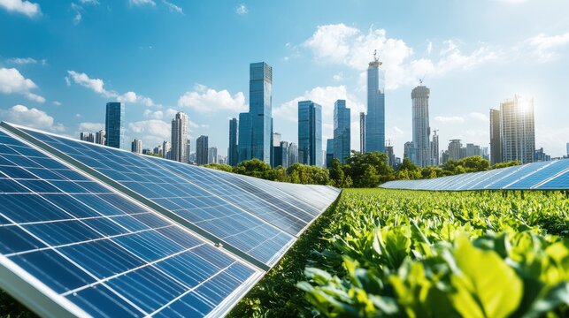 A vibrant image showcasing solar panels in a green field with a city skyline in the background, symbolizing the fusion of technology and nature for sustainable energy.