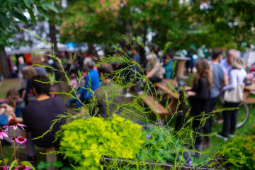 Closeup of plants growing against audience and trees during event at garden in city with selective focus at world and spoken word festival