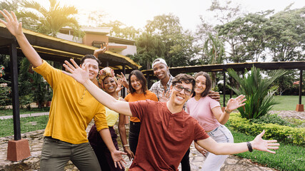 Picture from behind view of groups of friends embrace each other together. Concept for kindness support of people having fun with diversity millenials of gen z.