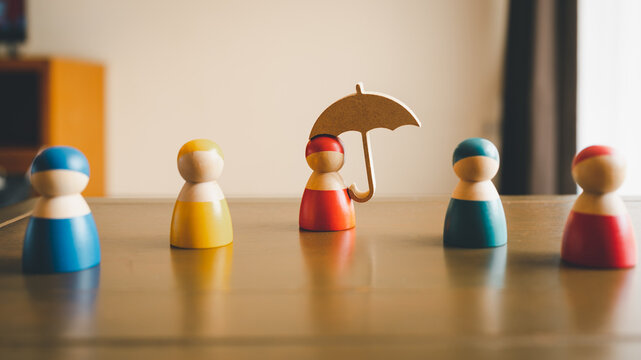 Umbrella icon and people model. Security protection and health insurance. The concept of family home, protection, health care day, car insurance.