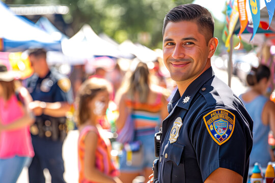 Smiling police officer at a lively outdoor event with people and booths in the background.