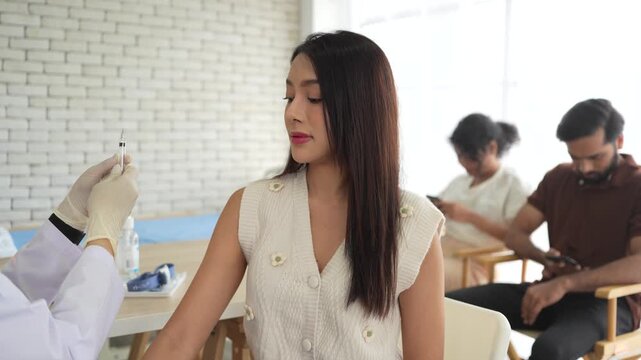 A young Asian woman watches as a doctor prepares a syringe for her vaccine shot. She is at a clinic to get her vaccination and stay protected from disease.