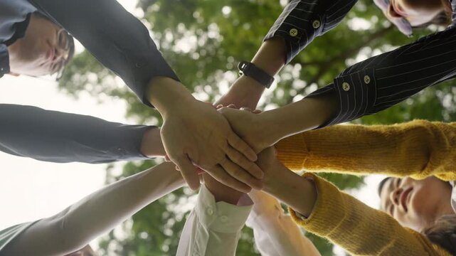 ESG,empathy,partnership and Social connection.Business people join hands together for CSR,corporate social responsibility.World environment day.Global community teamwork.Charity,volunteer, partnership