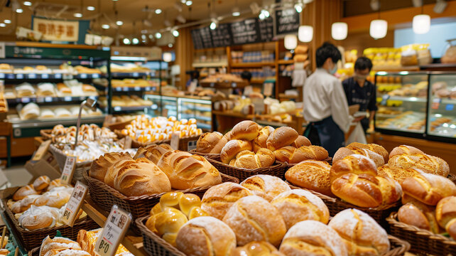 日本のスーパーマーケットのベーカリーコーナーとパン職人