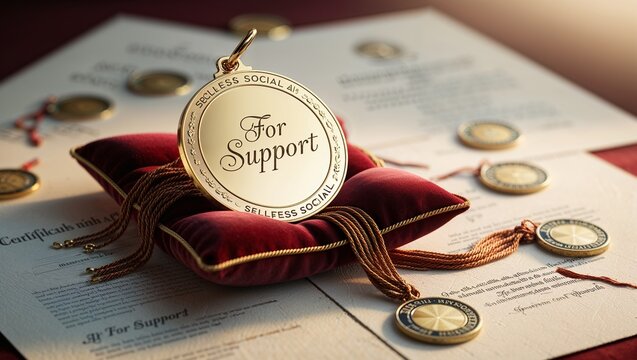 Social benefits concept showcasing a medal labeled 'For Support' on a velvet cushion surrounded by certificates