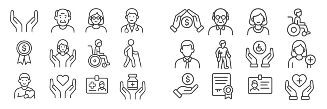 Icons representing care, health services, and support for elderly and disabled individuals in a simple line art style