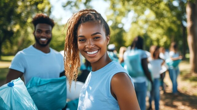Volunteers engaged in a community clean-up event, an image that underscores the importance of collective environmental efforts, ideal for showcasing Earth Day initiatives and community involvement.
