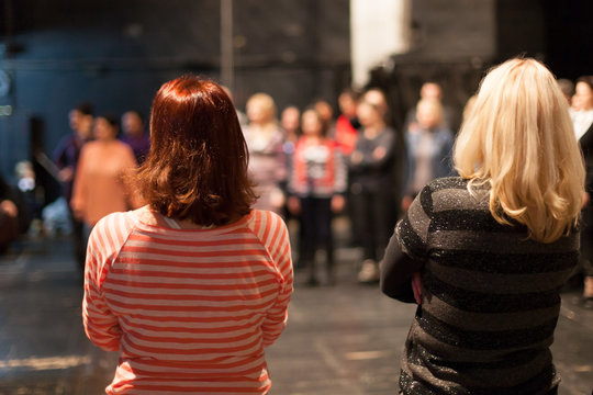 Behind the scenes. Dedicated actors and crew rehearsing in a cozy community theater