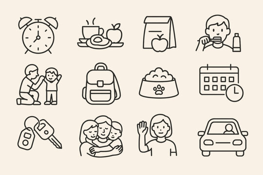 Simple line art icons of daily routine: wakeup, breakfast, brushing, family, commuting