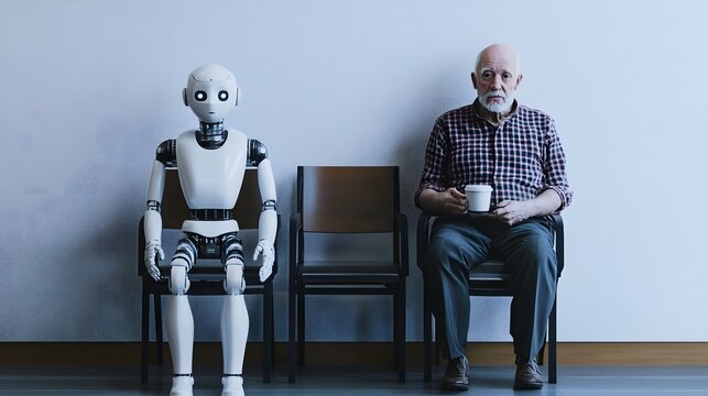 Elderly person walking with a robot companion in a park. Symbolizing human-robot interaction and companionship.