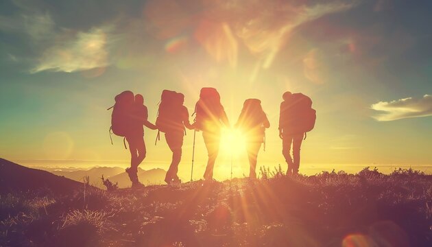 Figures of companions atop the mountain summit, hands aloft in triumph