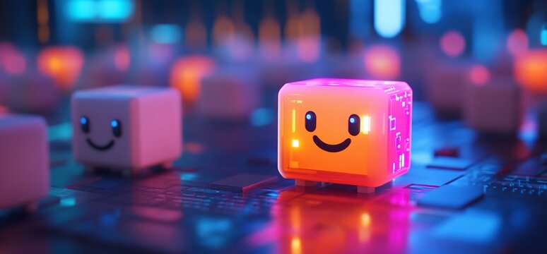 Whimsical electronic companions exploring circuit landscapes in vivid neon tones