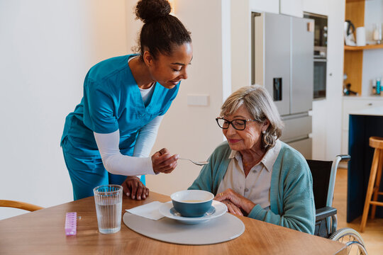 Compassionate caregiver embraces senior woman with a cheerful smile, offering support and companionship in a warm home setting representing quality care