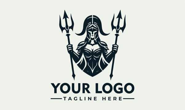Warrior woman holding tridents, stylized logo design, with space for company name and tagline.