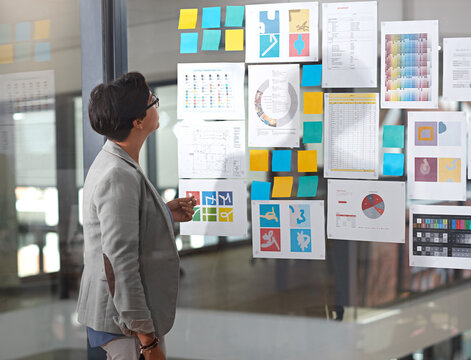 Business woman, documents and glass board with statistics for company growth, strategy or planning at office. Female person, employee or analyst with papers for schedule tasks or project overview