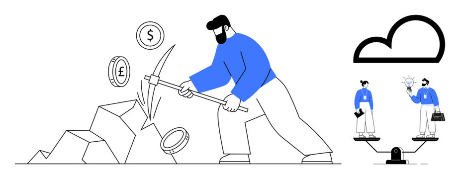 Man mining coins from rocks with a pickaxe, scalable comparison of teamwork and innovation, and cloud storage. Ideal for finance, teamwork, technology, innovation, labor, decision-making simple flat