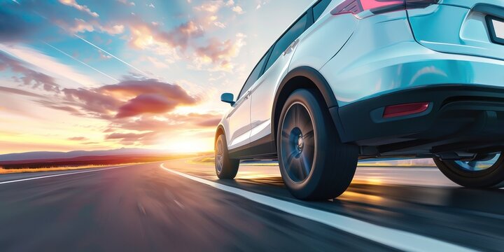L'arrière d'un véhicule électrique blanc roulant à grande vitesse sur une route dans un paysage désertique au coucher du soleil, flou de mouvement, image avec espace pour texte.