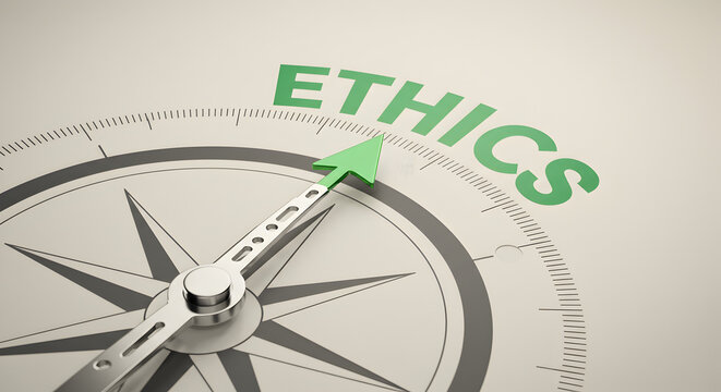 Ethics Compass Guiding Business Decisions with Green Arrow on White Background
