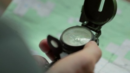 Over the shoulder of a man uses a magnetic navigational compass and map. Shallow focus.