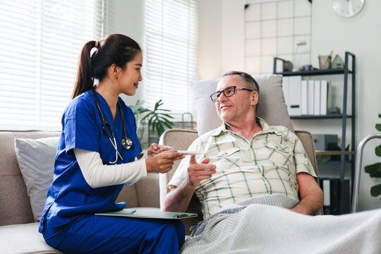 Young nurse caregiver helping elderly man at home, smiling interaction, compassionate care and medical support