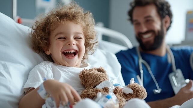 A happy child with curly hair is laughing while lying in a hospital bed, holding a teddy bear, with a male medical professional by their side.