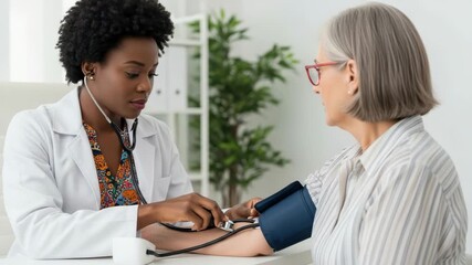 A compassionate female doctor uses a stethoscope to measure the blood pressure of an elderly female patient during a medical examination in a clinic