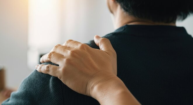 Comforting hand rests on person's shoulder, offering support and reassurance