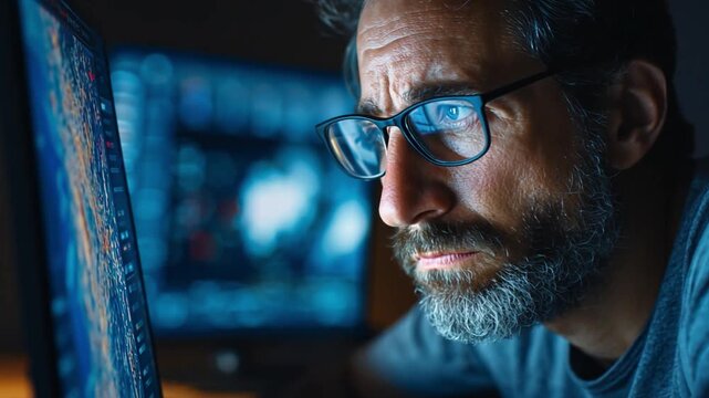 Deep Focus in the Digital Realm: A close-up of a person, engrossed in a monitor, showcasing deep concentration and a determined gaze reflecting the intensity of the digital environment.