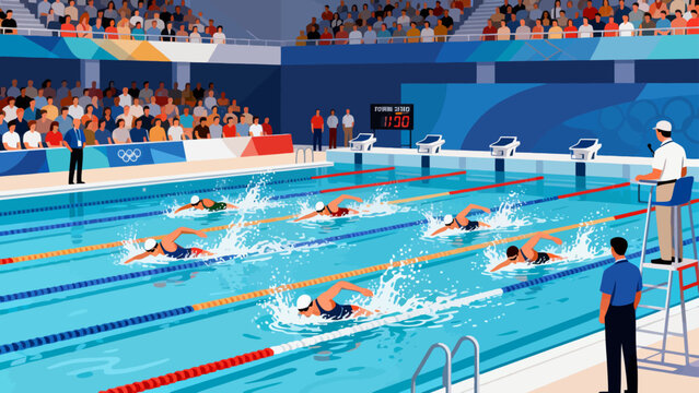 This illustration depicts a competitive swimming race in an indoor stadium pool, with athletes stroking through lane-divided water, spectators cheering in the stands, officials overseeing the event