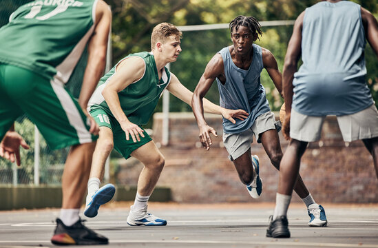 Energy, fitness and basketball at basketball court with team playing in competitive sports game. Exercise, training and sport challenge by group of players running, competing intense cardio workout