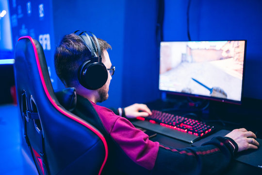 Professional young caucasian gamer playing online on his PC. He upset because of losing the game
