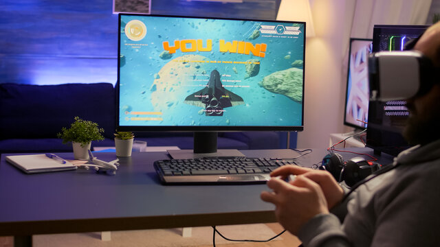 Pro gamer winning space shooter video games using virtual reality headphones and controller. Competitive player man using professional equipment with new graphics on powerful computer from gaming room