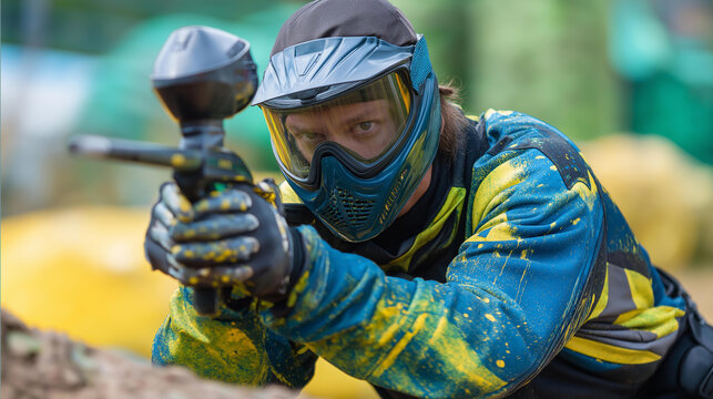 A paintball player dodges gunfire in a match hyper realistic paint splatters with vivid colors moody shadows on the gear bright saturation in player equipment paintball game