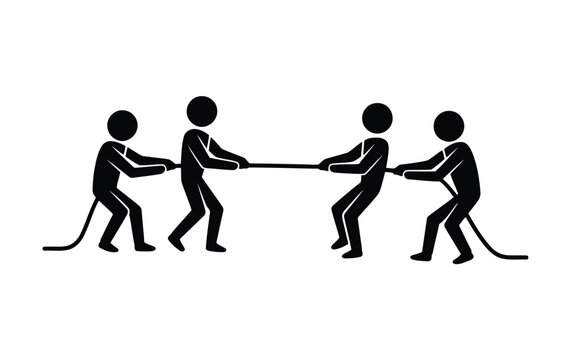 Black Silhouettes of Two Teams Engaging in a Tug of War on White