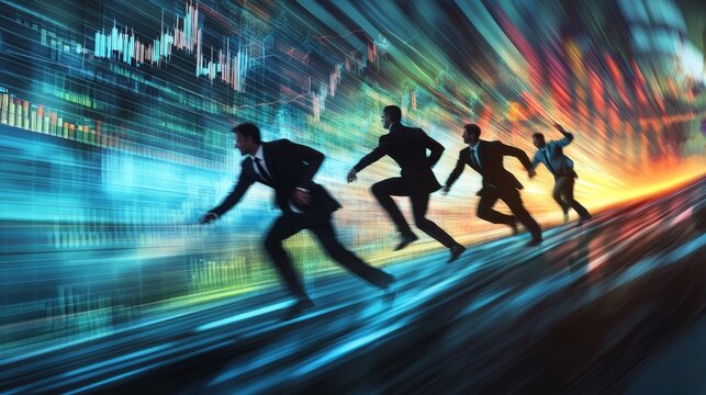 Corporate Executives in Career Competition Race with Financial Charts in Background
