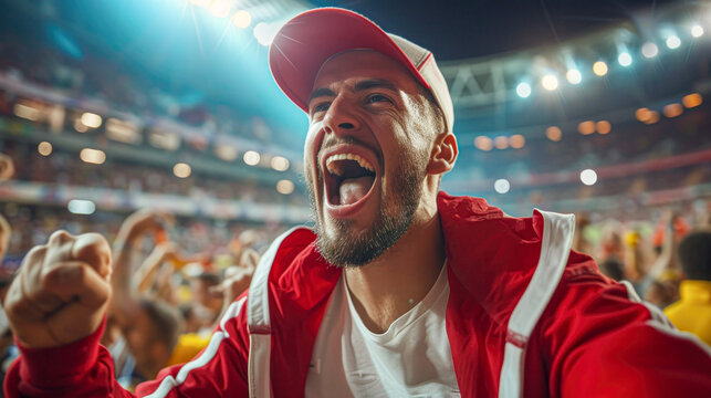 Excited Sports Fan Cheering in Stadium.Euphoric male sports fan shouting in support, surrounded by stadium crowd during a live sporting event, capturing the passion of fandom.