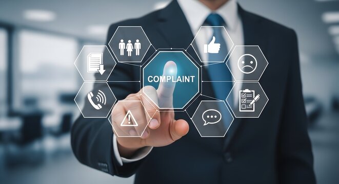 Professional businessman interacting with digital interface, touching 'COMPLAINT' icon surrounded by customer service feedback symbols in a modern office setting