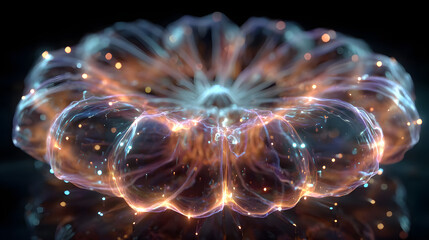 Neon pumpkin hologram projected by drone swarm, rim light + fill blend, freeze-motion capture, energetic futuristic vibe, complementary orange-=