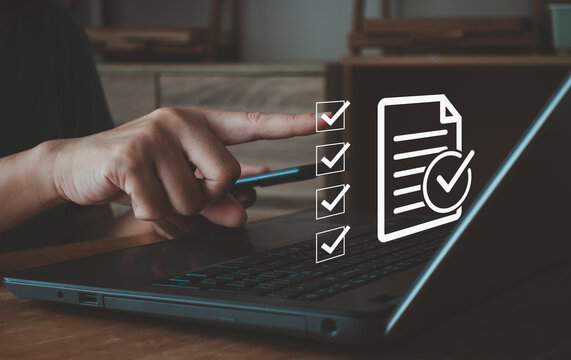 laptop with holographic digital checklist completed validation marks