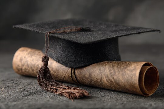 Black mortarboard cap resting on a rolled diploma with a brown tassel in a dimly lit setting celebrating college graduation achievements